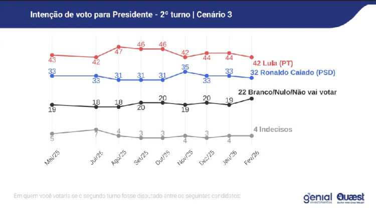 O petista venceria todos os cenários de segundo turno. Contra Ratinho Júnior, Lula tem 43% das intenções, enquanto o governador do Paraná aparece com 35%. Contra Ronaldo Caiado (PSD), Lula cai um ponto, enquanto o governador de Goiás aparece com 32%.
